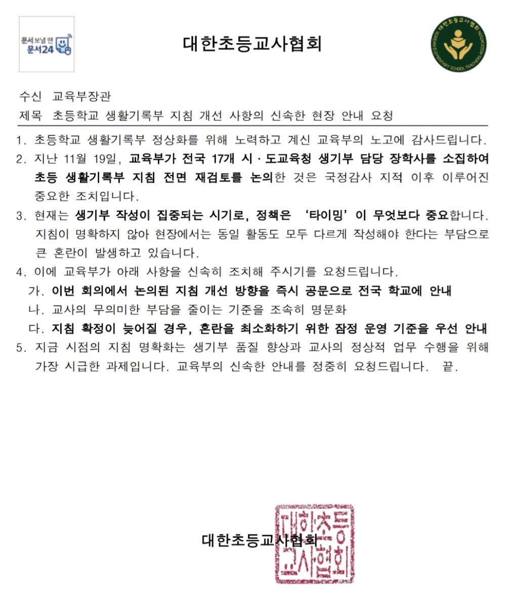 초등 생활기록부 지침 개선 회의를 열었습니다.
